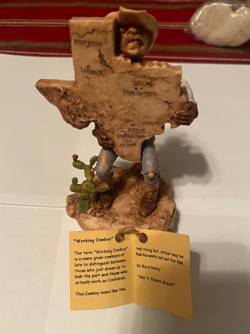 I was born in Tatum, New Mexico on January 30, 1939. I began wood carving and designing figurines around age 12 and have carved & sculpted thousands of pieces since that time. Most are miniatures, 2" or less tall. Look for my pewter being produced by Rawcliff Corp. of Providence Rhode Island called "Boyd Perry's Little America". Also I have a new line of hand painted porcelains that are produced/marketed Bubelino Inc. of Tyler Texas called "The Wind River Ranch". Look for them in gift shops and farm & ranch gift sections across the nation.